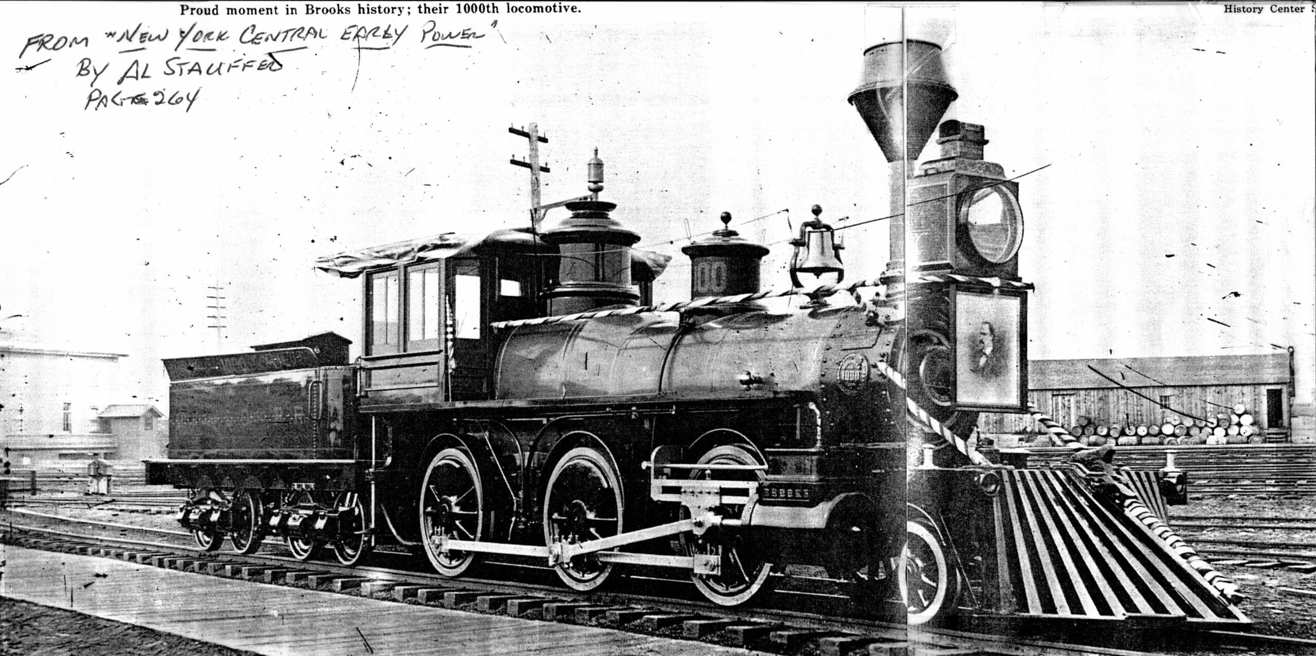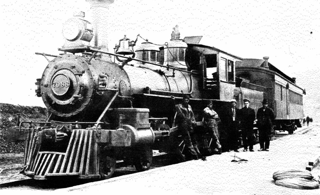This road was formed in 1897 from part of the Cincinnati, Jackson & Mackinaw. In 1883 Brooks built five 4-4-0’s for the Michigan & Ohio, which later became C-61. The following year Brooks delivered eight Moguls for the same road. They later became E-60. One of these engines caused quite a stir up in Dunkirk, New York. Seems like it bore construction No. 1,000. Yep! their one-thousandth locomotive was turned out for the Michigan & Ohio. Now this event wasn’t going to slip by unnoticed. Red, white and blue crepe adorned all her handrails and beneath the headlight hung a picture of Brooks’ president. Her M. & 0. number was 26 but, for the moment at least, the huge number 1,000 graced her sand dome and tender. Seven of these Moguls were later assigned to the Detroit, Toledo & Milwaukee, then scattered to the Cincinnati Northern (4), Michigan Central (2), and one to the L.S. & M.S.