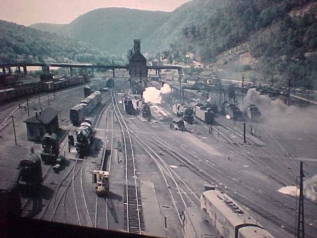 There was no caption with this pic, but I believe we’re looking at an engine facility around the early ‘50’s. I see a lot of doghouses on the tenders of the steamers. There appears to be an F unit with a radio antenna paired with another unit, and maybe an E unit in the lower right corner. There’s a pit to the left – maybe an ash pit. There appears to be a water spout mid right. And that’s a coaling tower off in the distance before the overpass. I can’t see anything that provides the owning RR, but with the eastern looking mountains along the river in the background, the doghouses on the tenders, and the radio antenna on the F unit, my first guess would be a PRR facility. Also, on a further look, the steamers appear to have Belpaire fireboxes – a dead giveaway that it’s PRR.