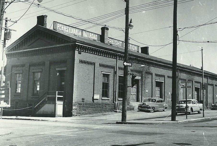 The caption says this is the PRR in Latrobe PA, 1950s. I had to look up Latrobe – It’s part of the Pittsburg metro area, roughly 30 miles east and a touch south of the center of Pittsburg. A small version of the pic led me to believe that the wedge shaped building might have been a roundhouse with the “bridge” being a small turntable (not aligned very well). But as I blew the pic up, the wedge building is a “Super A&P Market”. The “bridge” is actually a drop-end gondola backed up to a ramp/dock. It looks like they’re gradually loading trash or scrap metals into the gondola. The PRR freight station in the foreground is a masterpiece of era structures. There’s an obvious addition to the freight house on the far side. Check out the car bumpers to the left of the freight house! The passenger platforms on the tracks to the far left are pretty long – must have a bit of commuter traffic. The platforms sandwich what appears to be the mainline which is either two or three track. The mainline tracks appear to have a third rail reinforcing a possible commuter line – never checked to see if the PRR ran electric lines all the way to Pittsburg. There’s a large stonewall maintaining the level on this side of the platforms, and the opposite side appears to drop even further. Finally, there’s a nice team track between the freight station and the passenger platforms. The trucks by the open boxcars help make the scene.