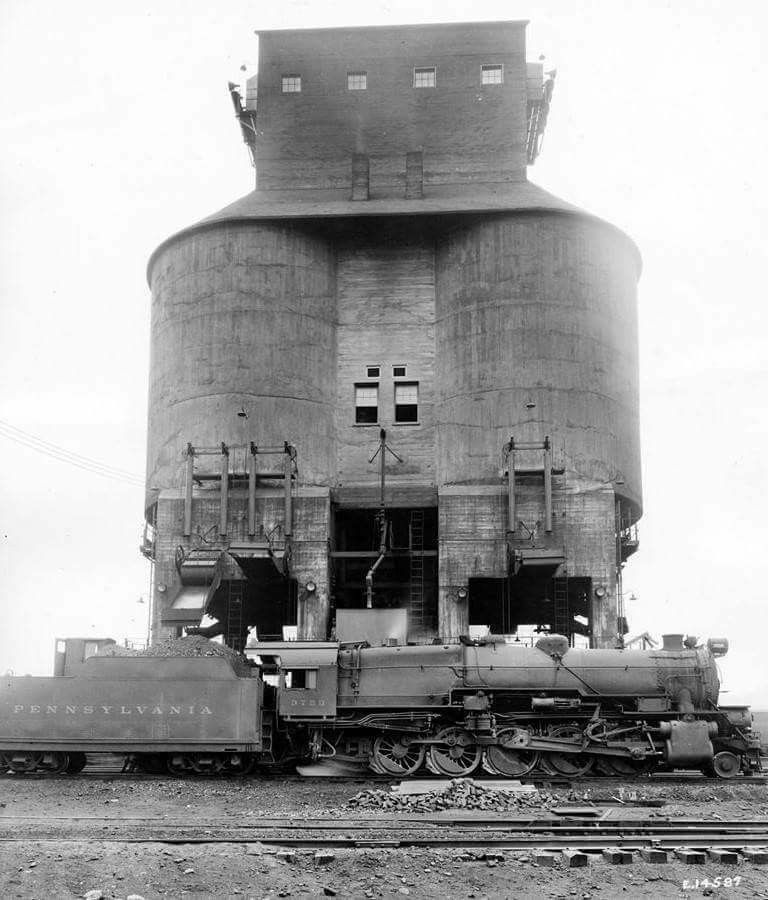 Here’s a great PRR concrete coaling tower. I didn’t find its location, but I’m sure someone knows where it was at! Check out the terrain around the tracks by the tower – great insight into how to scenic/ballast such a facility. Also, a great look at a PRR Decapod – can’t make out the number.