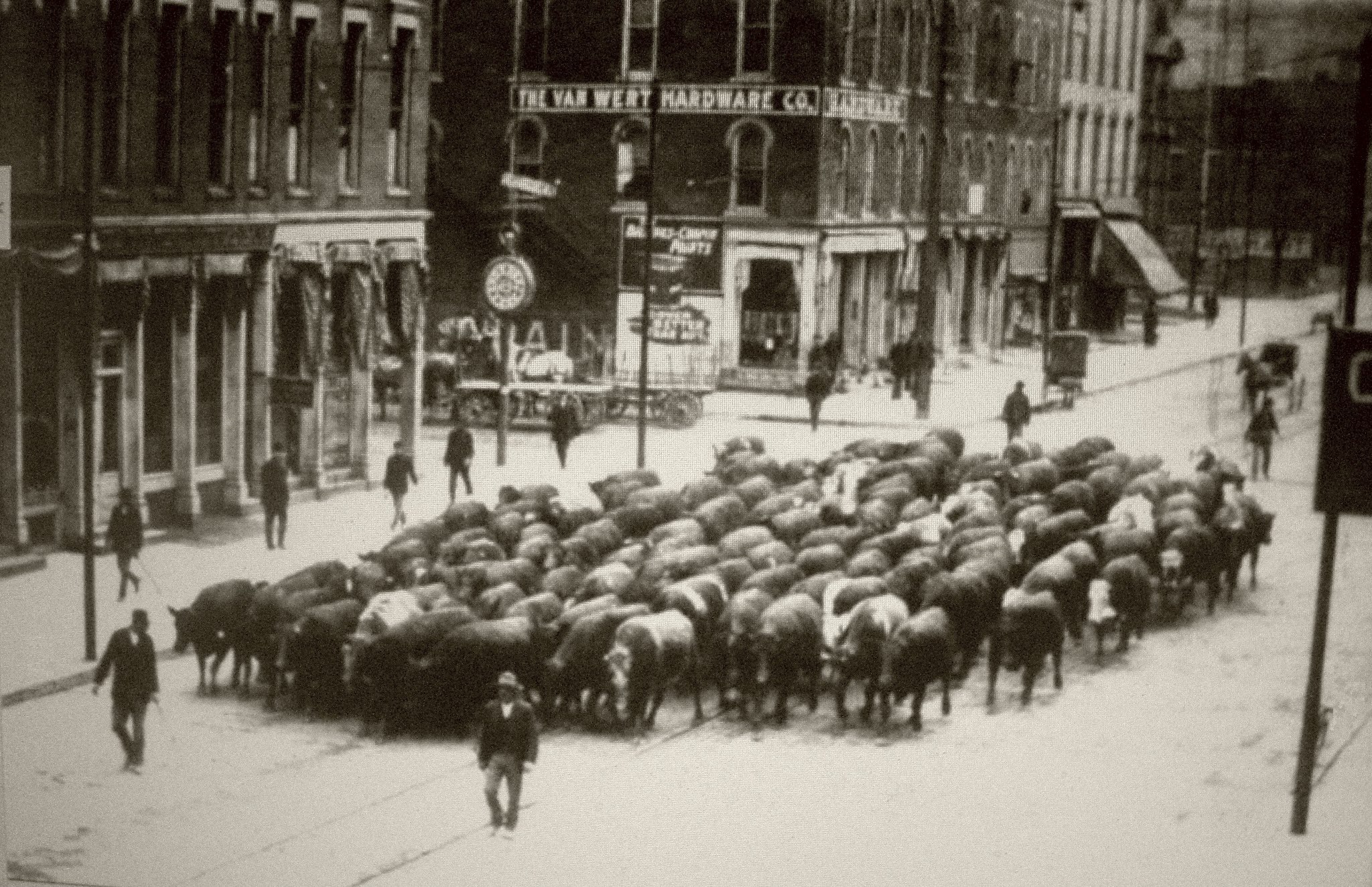 This is probably a bit early for our era, but a fun picture – cattle farmers are driving their herd through the streets of Van Wert on the way to the stockyards. I think that’s the interurban tracks down the middle of the road.