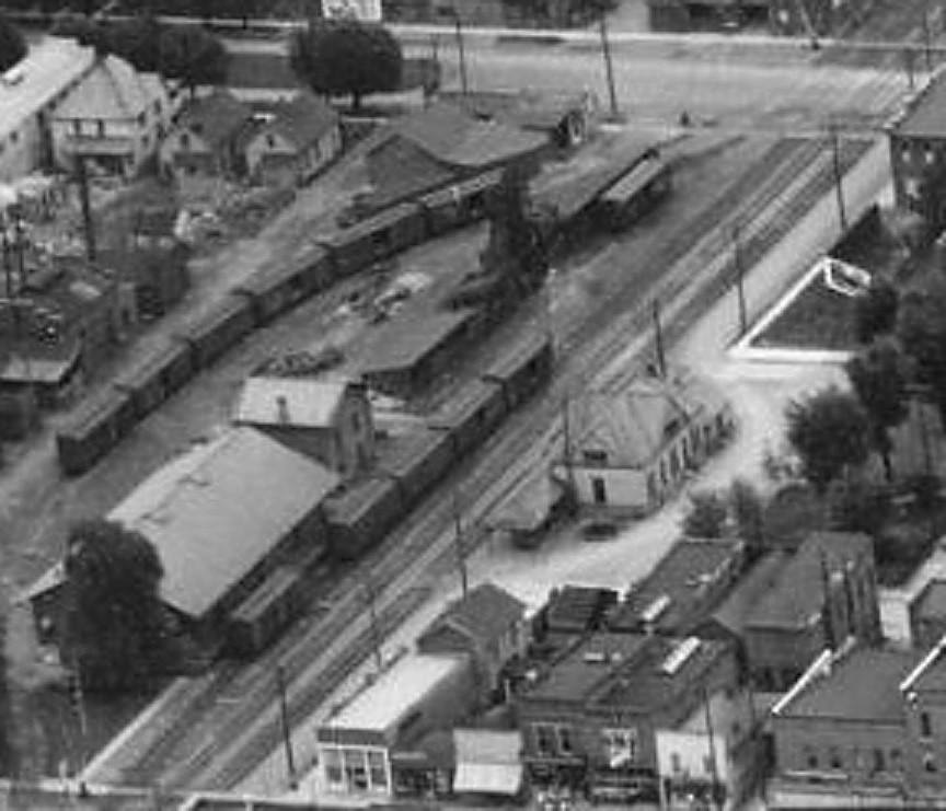 The aerial view gives us a better idea of the locations. I think the view is east. The PRR station is on the right. The PRR freight house is on the left of the tracks. The curved track with a number of boxcars is next to the Railway Express depot. Town creek would be a block closer than the foreground, and the CNor would be about 3 blocks closer than the foreground.