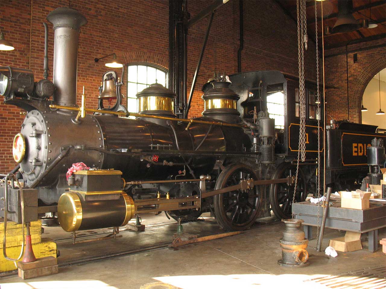 This is a pic from inside the roundhouse at the Henry Ford Museum complex. The capped straight stack of Edison #1 matches the revised stack of CN #110. What’s additionally nice about this photo is a clear vision of what can be seen of the Stephenson valve gear. The models don’t typically give you much since most of the valve gear is under the boiler between the wheels and the side rods. What has disappointed me is that most of the models don’t give you the valve rod out of the valve box (above the cylinder). This is the one clearly visible part of Stephenson valve gear – but the model builders don’t typically provide it. This pic clearly shows the valve rod and attachment back to the valve gear. Also note, this loco was built by Manchester Locomotive Works – and it has an arched cab roof like the Brooks!