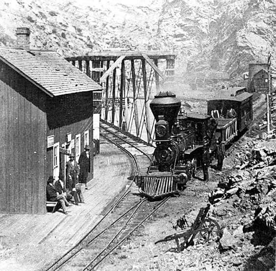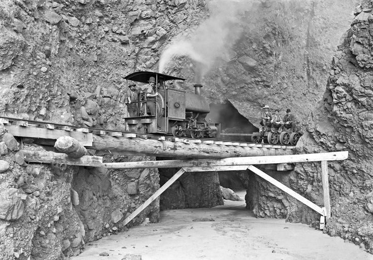 When I saw this pic, I had to chuckle. It includes several interesting branch line features. Note the crew – a rather motley looking pair. The loco is a small 0-4-0T with a mostly open cab. The loco is traveling backwards pulling at least one small car. The car seems to be couple to the pilot of the loco with a long bar. It’s an open car with probably nothing more than a platform between the wheels that seats (3) VIP-looking gentlemen. The bridge/trestle is built rather crudely from large timbers wedged into the rocks. Sand and/or a small stream bed flows under the bridge. The stream looks dry, but during rainy seasons, with the mountainous surroundings, it probably swells to a level threatening the bridge.