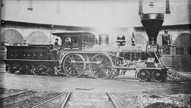 Similar to the previous, I couldn’t find much info on the “Louisville”. I studied this photo for quite a while. It has very large drivers – probably around 6’ diameter. And the pilot wheels are placed very close to each other. But what stumps me is I couldn’t find the cylinders! Notice how the side rods connect the two drivers, but there is no side rod visible that connects the drivers to a piston rod coming from a cylinder. There appears to be a valve box in the correct position below the smoke box. And, the valve box has what appears to be a steam line coming in the top (as typical). From what I can see, I’m guessing the valve gear is a Stephenson or similar. There is just no cylinder visibly attached to what I assume is the valve box (??). But, the cab roof is arched. Check out the large arched wooden doors to the roundhouse.