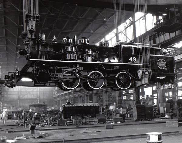 Grand Trunk #49 is a Forney steamer that serviced the Grand Trunk Montreal commuter line. #49 is being lifted in the Pointe St. Charles erecting shop. The last steam locomotive was outshopped August 23, 1957. Canadian National Railways.