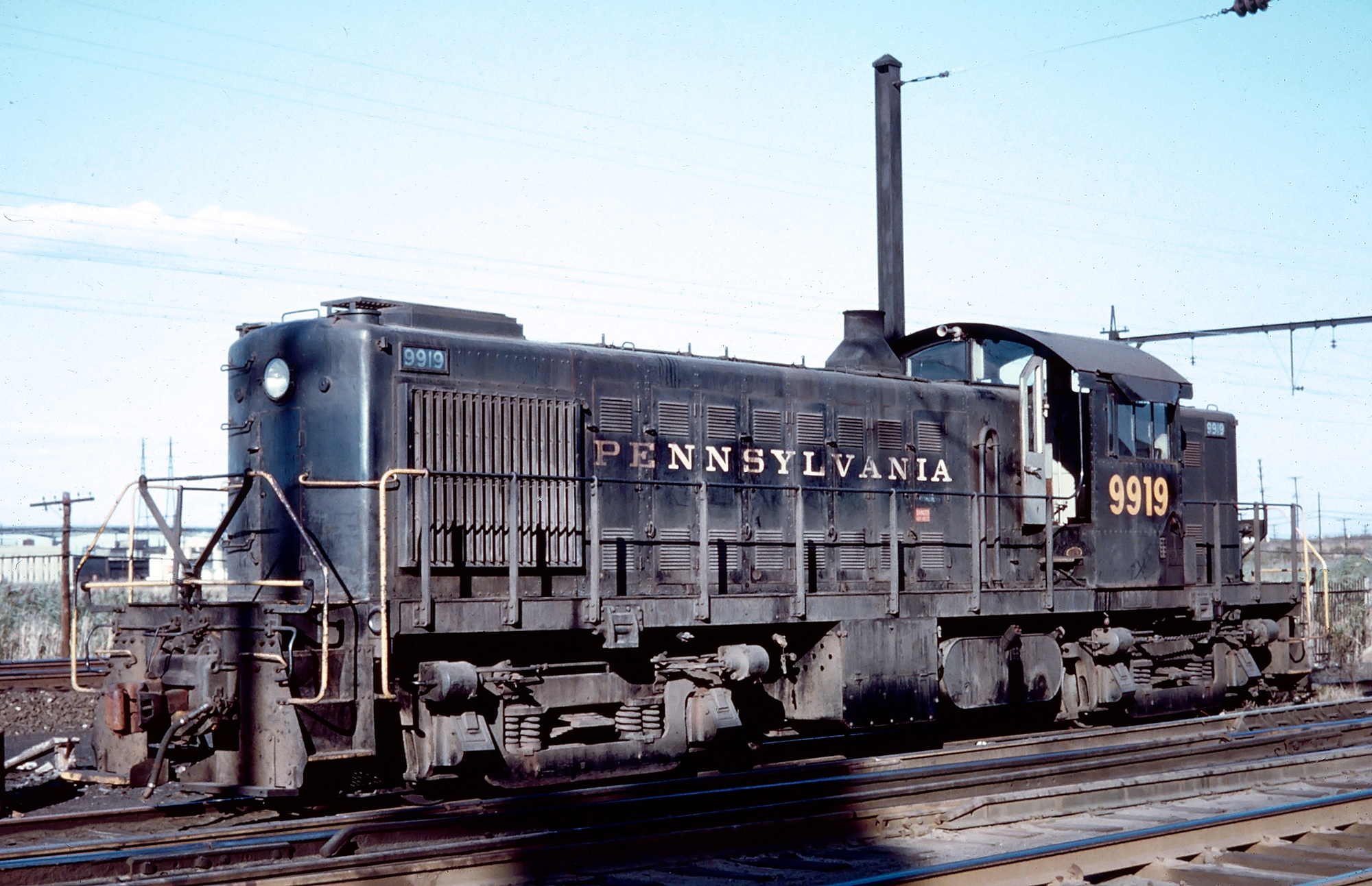 The RS-1 was one of the first hooded units where the cab extended above and beyond the sides of the hoods to increase visibility. The RS-1 design of hooded locomotives with better visibility set the standard for modern diesel-electrics built by all the major manufacturer’s. Classified as a road switcher (RS), the RS-1 could travel easily in either direction with near equal visibility in each direction. The RS-1 had a 19 year production life with a lot of units still in service in the ‘70’s. Quite a few are still used on short lines and on scenic railways. Even though ALCO disbanded in 1969, replacement parts continued to be produced by third party manufacturers. Here’s Pennsylvania RS-1 #9919 at Meadows Yard in Kearny, New Jersey, circa 1967. Fred Byerly photo. American-Rails.com collection.