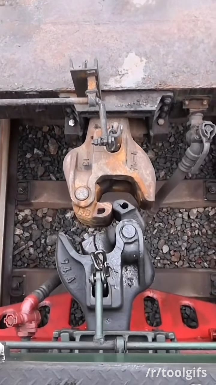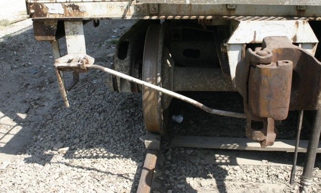 Here’s a great photo of a freight car coupler pull lever. Note that this one works from below the coupler.