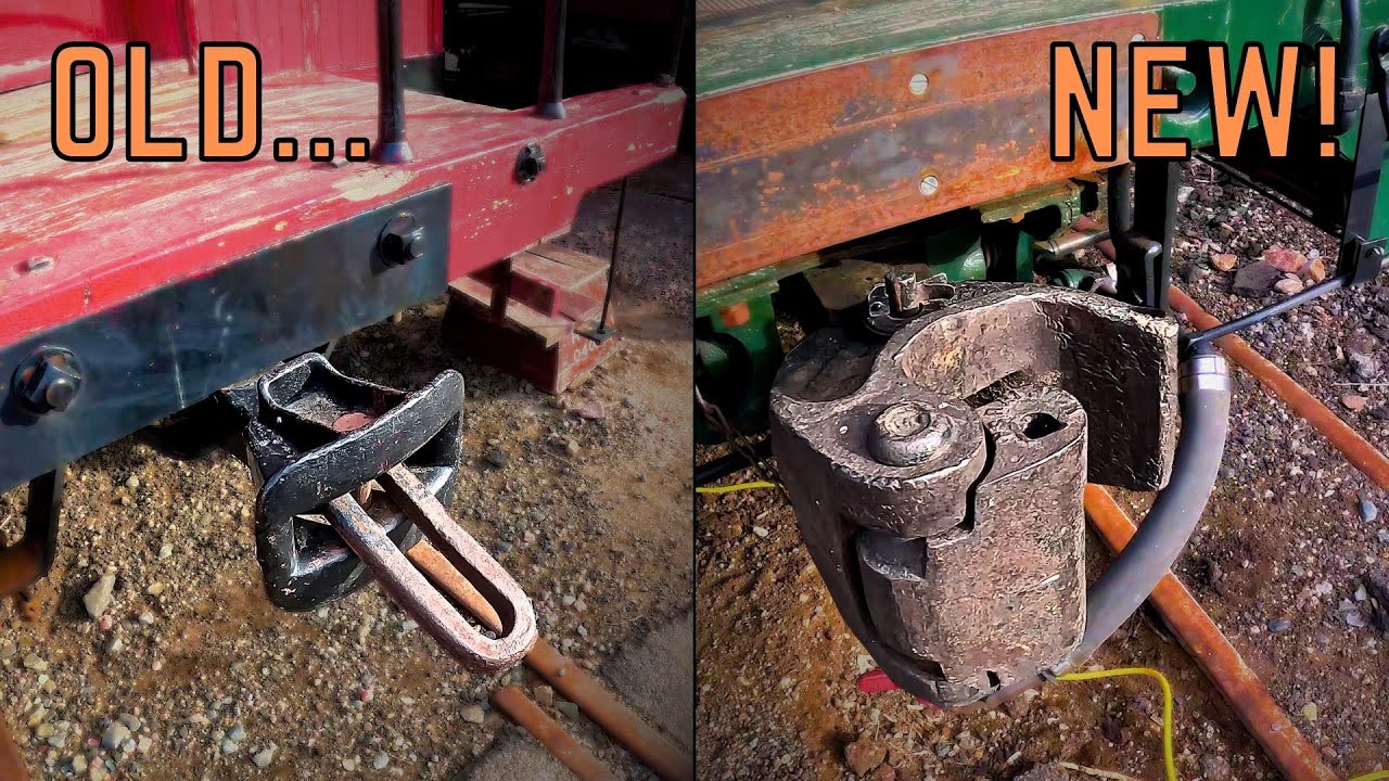 I found this great pic of an AAR Type E coupler (left) circa 1932, coupled to an MCB Type 5 coupler (right) designed in 1893 and part of the 1893 Railroad Safety Appliance Act. Note the difference in the pocket.