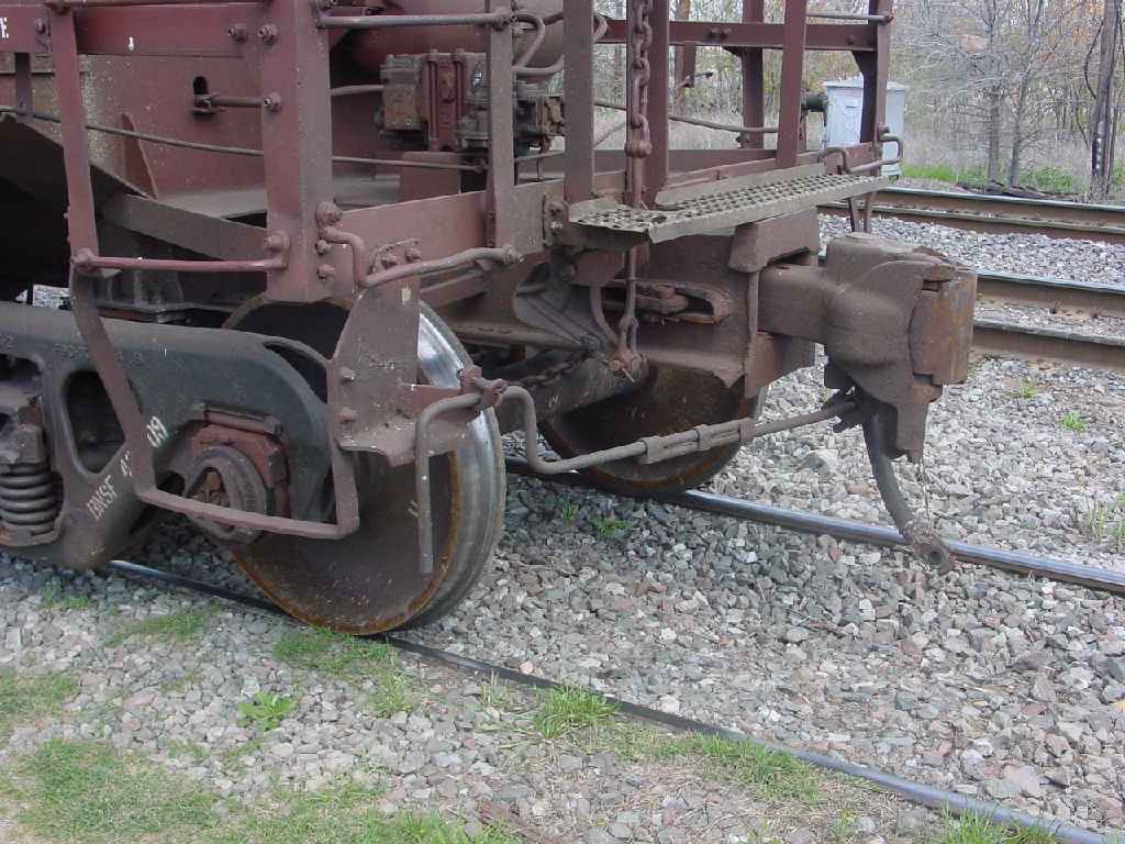 Here’s a great photo of type E couplers with the coupler pin pulled on the bottom one. Note that the coupler pin is linked to a rod that runs to the pull lever on the side of the car (pull levers are not shown in the photo). The top coupler pull lever is only on one side – the left side of the photo. I recently learned that most car couplers have levers on just one side. Since the two ends face opposite directions, with pull lever side standardized, you can walk down one side of the car, either side, and pull a coupler pin for each coupling in the train. In the pic, the bottom coupler has lever rods going towards both sides. This is likely a locomotive coupler; locomotive couplers tend to have pull levers on both sides.