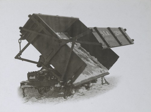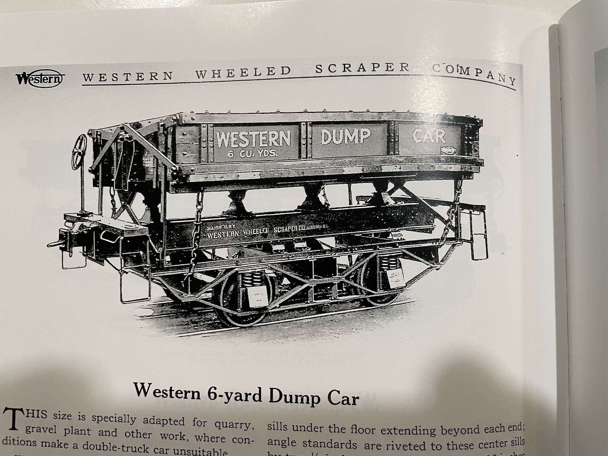 Monty found two clues as to the builder of these cars. WWS was embossed on the wheel journal covers, and Western Wheeled Scraper Co. was embossed on the wheels. A quick internet search produced info on the Western Wheeled Scraper Co. and their Western Dump cars. Here’s pic taken from some of the internet literature.