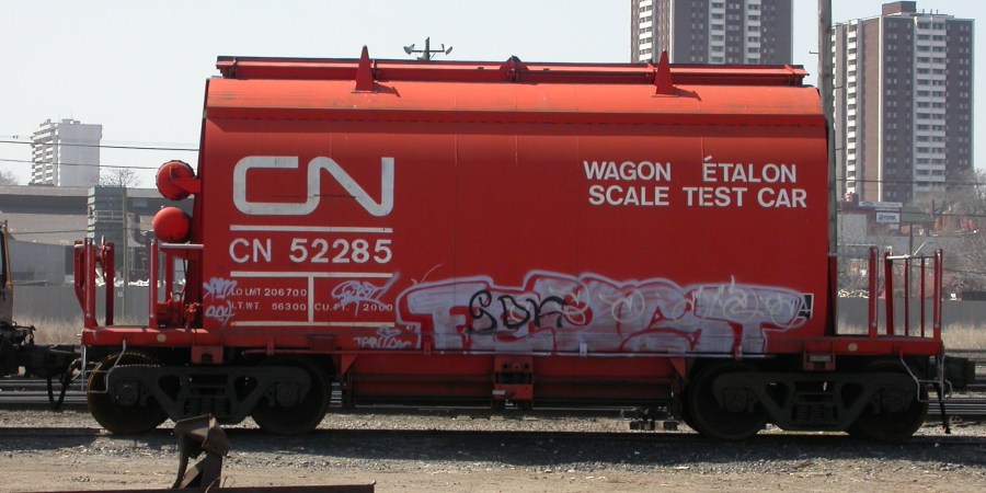 Test cars for the RR car scales were necessary to keep the scales calibrated. Hereās a modern test car ā CN #52285.