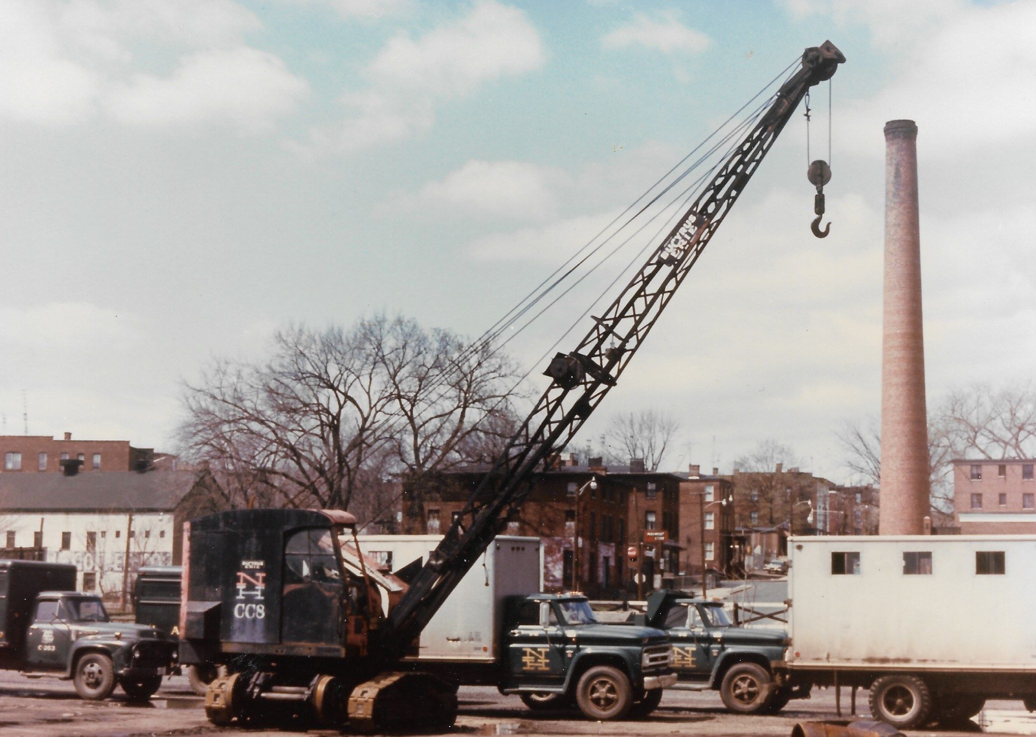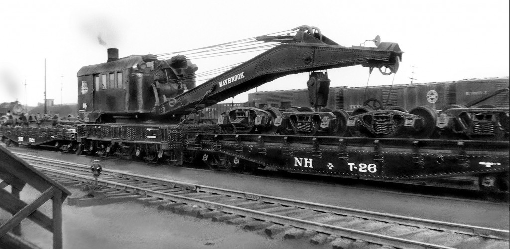 Cranes are always an important and a desired (by MRāers) piece of equipment for the MOW track. New Haven #CC8 is a lighter crane. Note the wheels lift to allow the crane to move on its tracks. This pic was taken in 1967 at Hartford, CT.
