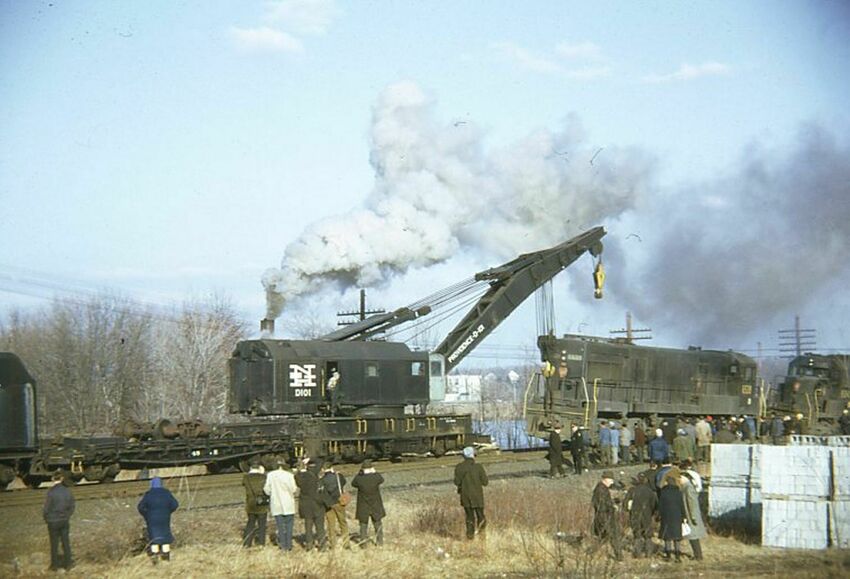 Hereās a heavier crane, NH #D101 rescuing a derailed Penn Central unit. The mishap was on the old New York Central/B&A in Natick, MA. Seems the number of supervisors is pretty large!