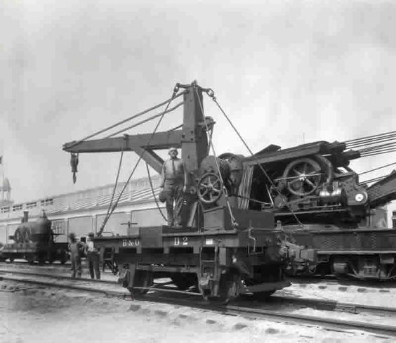 This is a great pic of a duo ā B&O #D2 small crane/derrick with what appears to be a large steam crane behind it.
