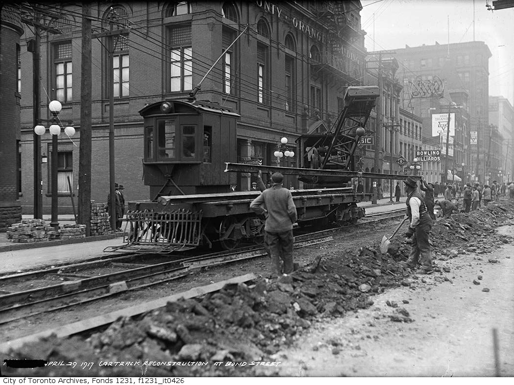 When I found this pic, I had to throw it in ā this is an electric crane being used to help lay rail on the Toronto streetcar line in 1917. Great pic!
