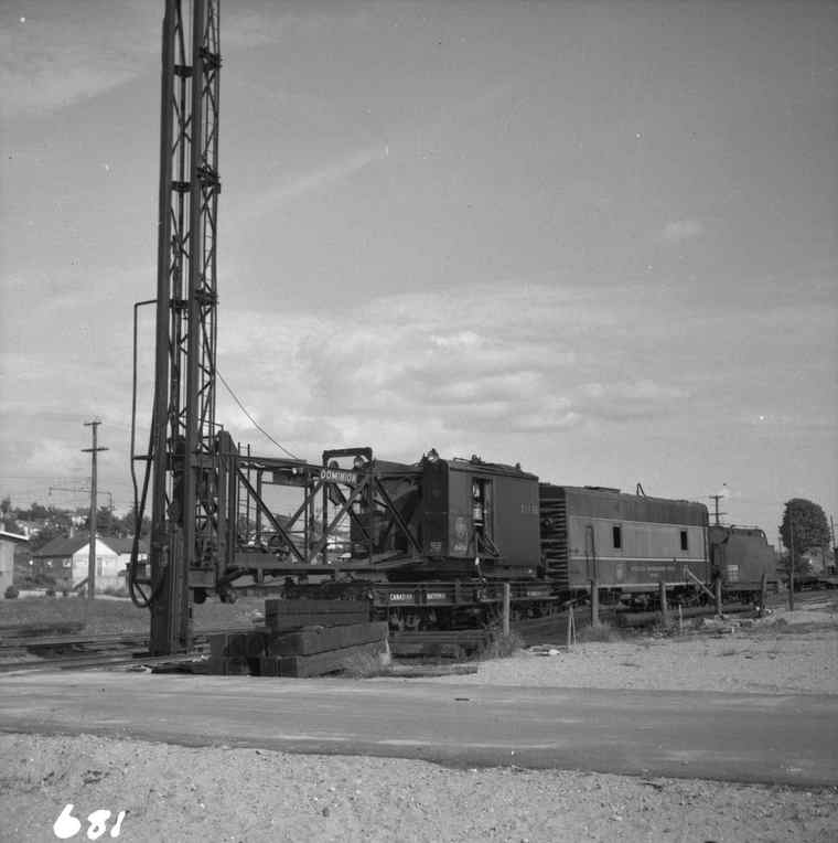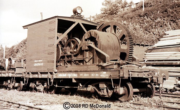 Another Canadian National pic ā CN #0515 is a Lidgerwood (winch), built by Lidgerwood Manufacturing Co., New York City. Pic is taken in Prince Rupert, BC August 28, 1958. These powerful winches were used by railways and contractors to build and maintain tracks. They were powered by steam from the locomotive and were quite powerful dragging a plow through several gondola loads of ballast. They were always simply called a “Lidgerwood” since the manufacturer’s name was painted on the side and it was an easier way to identify it.