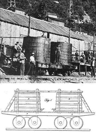 ā¦And now ā off to the off-topic: I had to show this pic immediately for fear that I wouldnāt find it again. I found this pic of the first type of petroleum tank cars! Write up: āFlatbed railroad cars with two oil tanks became the latest oilfield infrastructure innovation after James and Amos Densmore received a U.S. patent on April 10, 1866. The brothers from Meadville, Pennsylvania, received a patent for their āImproved Car for Transporting Petroleum,ā developed one year earlier in the booming oil region of Northwestern Pennsylvania.ā Check out the modified archbar trucks. It appears that they have leaf springs and possibly an extra suspension layer.